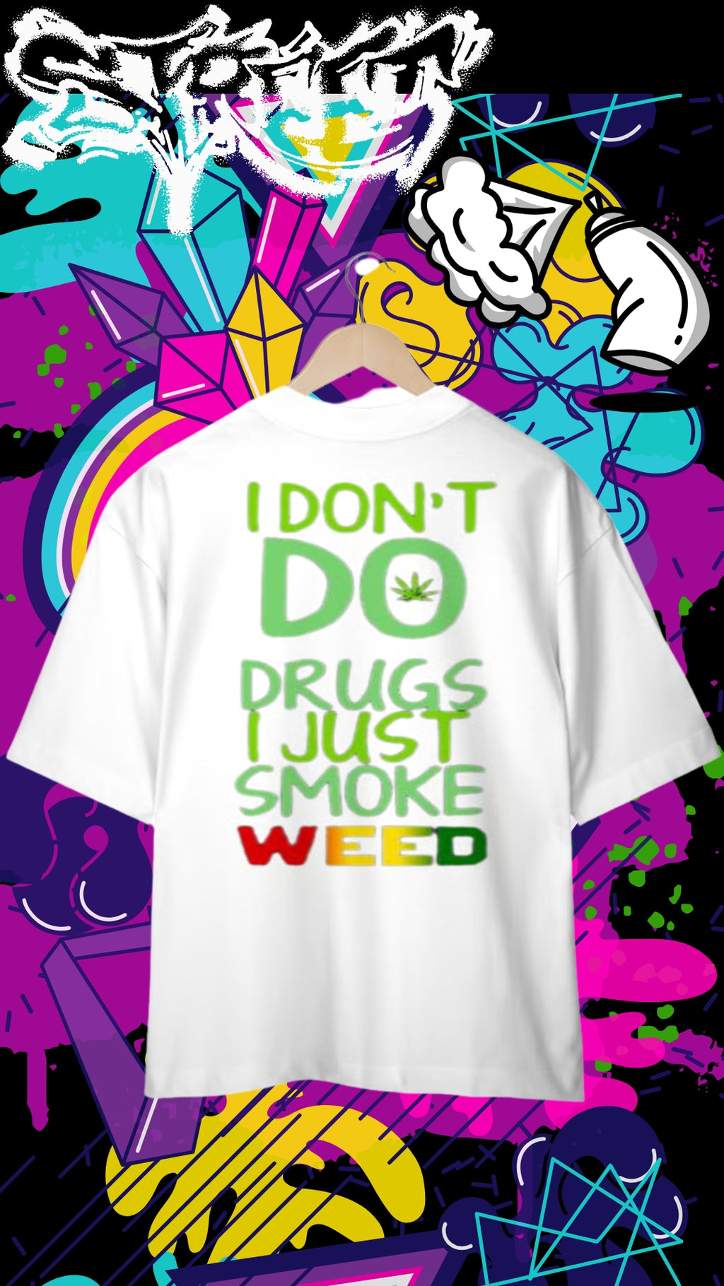 A camisa oversized possui um fundo branco e um design gráfico em estilo street art/graffiti. O destaque da estampa é um personagem em formato de baseado antropomorfizado, com olhos expressivos usando óculos escuros vermelhos com um símbolo de raio. Ele está em movimento, aparentando estar correndo ou saltando, e exibe uma expressão exagerada com a língua para fora.