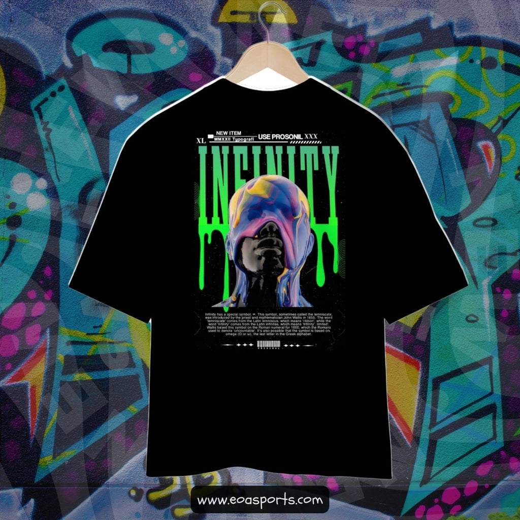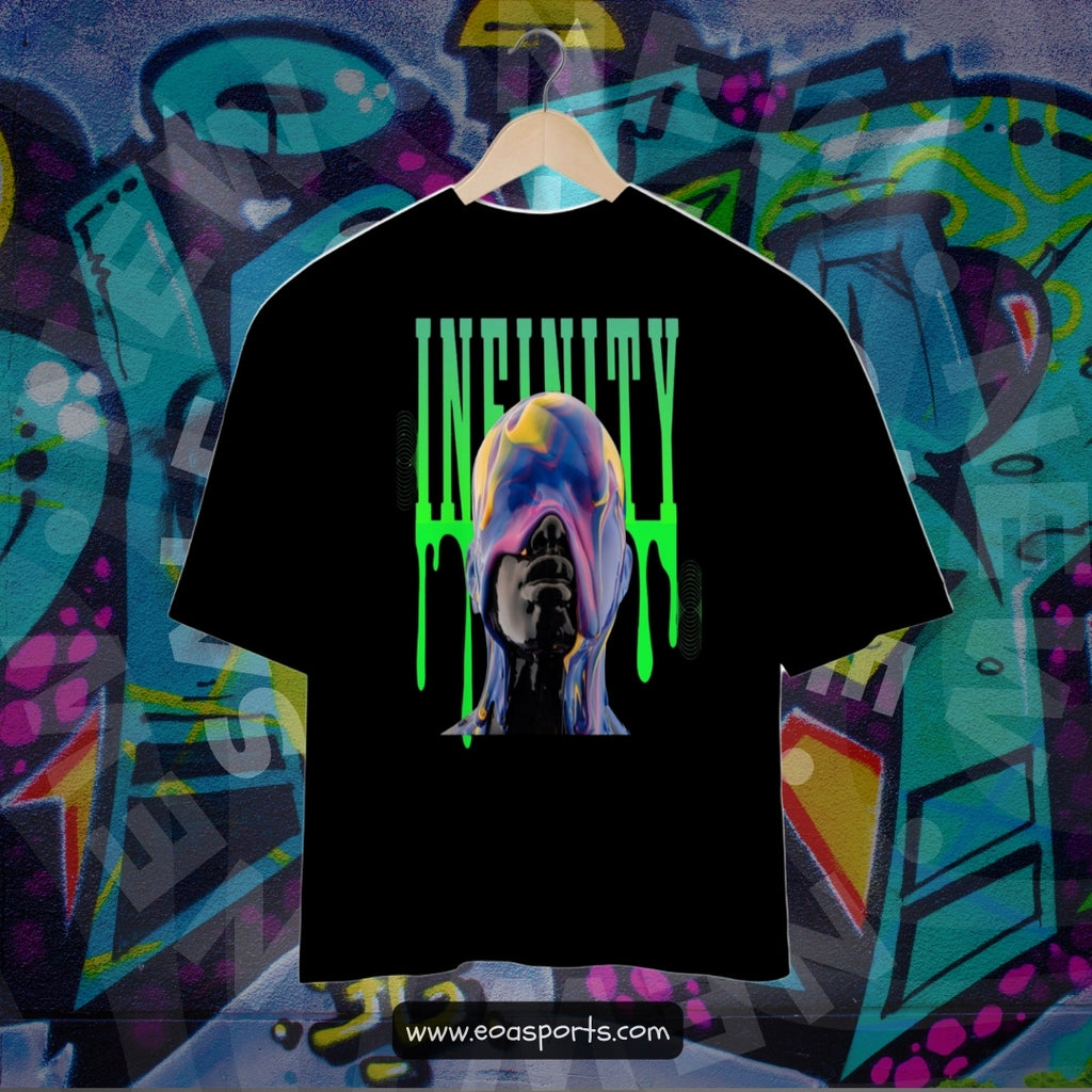 A imagem apresenta uma escultura digital de um busto humano com o rosto virado para cima. A superfície do rosto é preta, brilhante e reflete luz, dando uma aparência de material como vidro ou plástico. Sobre essa superfície, há uma textura colorida e fluida em tons de roxo, azul, amarelo e rosa, que parece se misturar e fluir, como tinta derretida ou psicodélica. Ao fundo, a palavra "INFINITY" está escrita em uma fonte verde e grande, com algumas partes das letras escorrendo, reforçando o efeito de fluidez. Há também elementos de linhas onduladas em verde-escuro nas laterais da imagem.